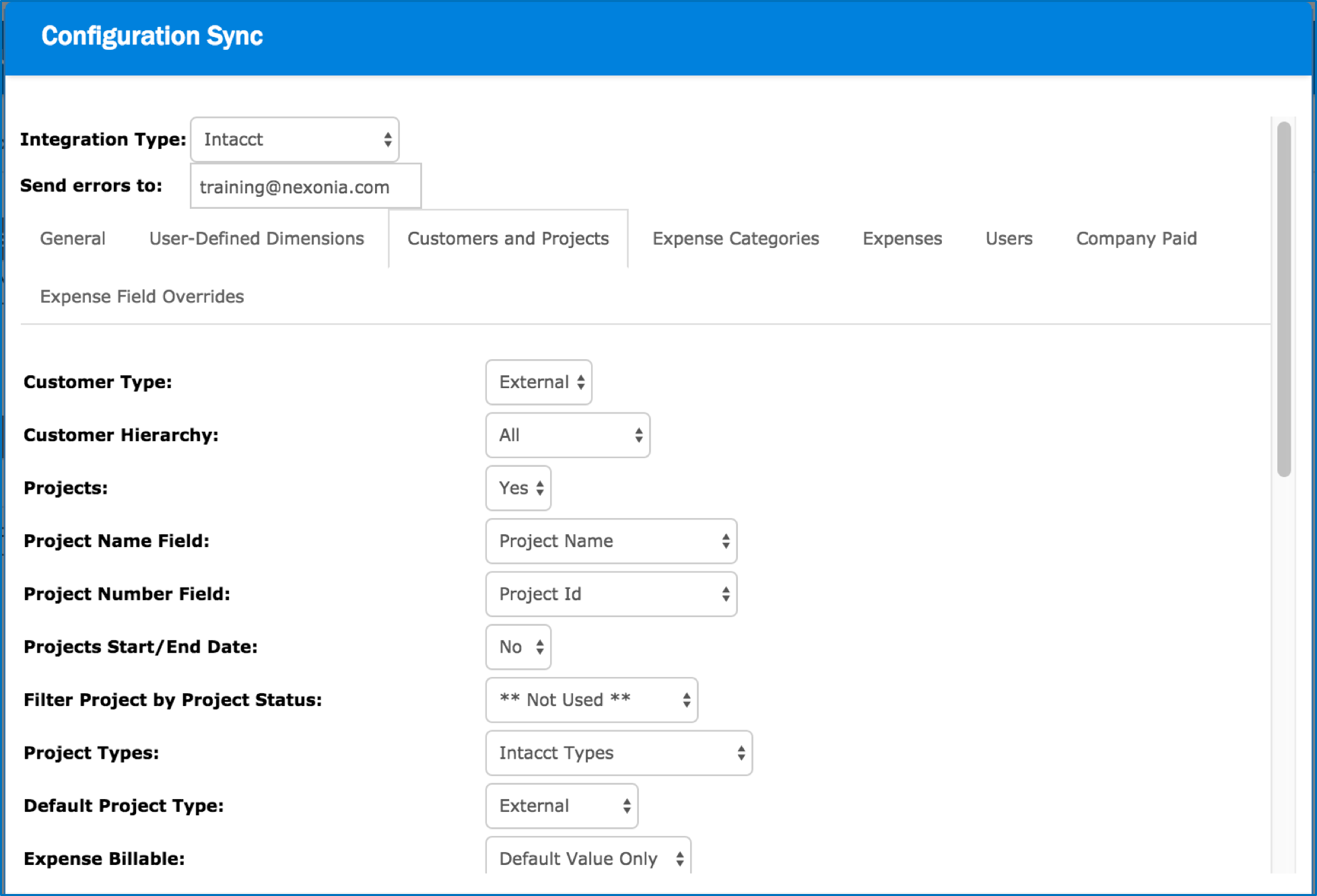 Synchronize Project Restrictions: sync Nexonia’s project permissions with the Intacct Project – User Restrictions – typically enabled for Timesheets.