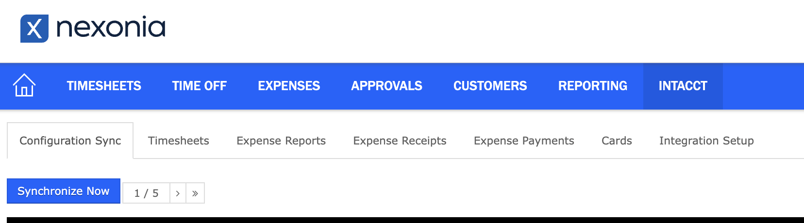 Step 3: Run the configuration sync from within Nexonia at INTACCT* >> Configuration Sync >> Synchronize Now.