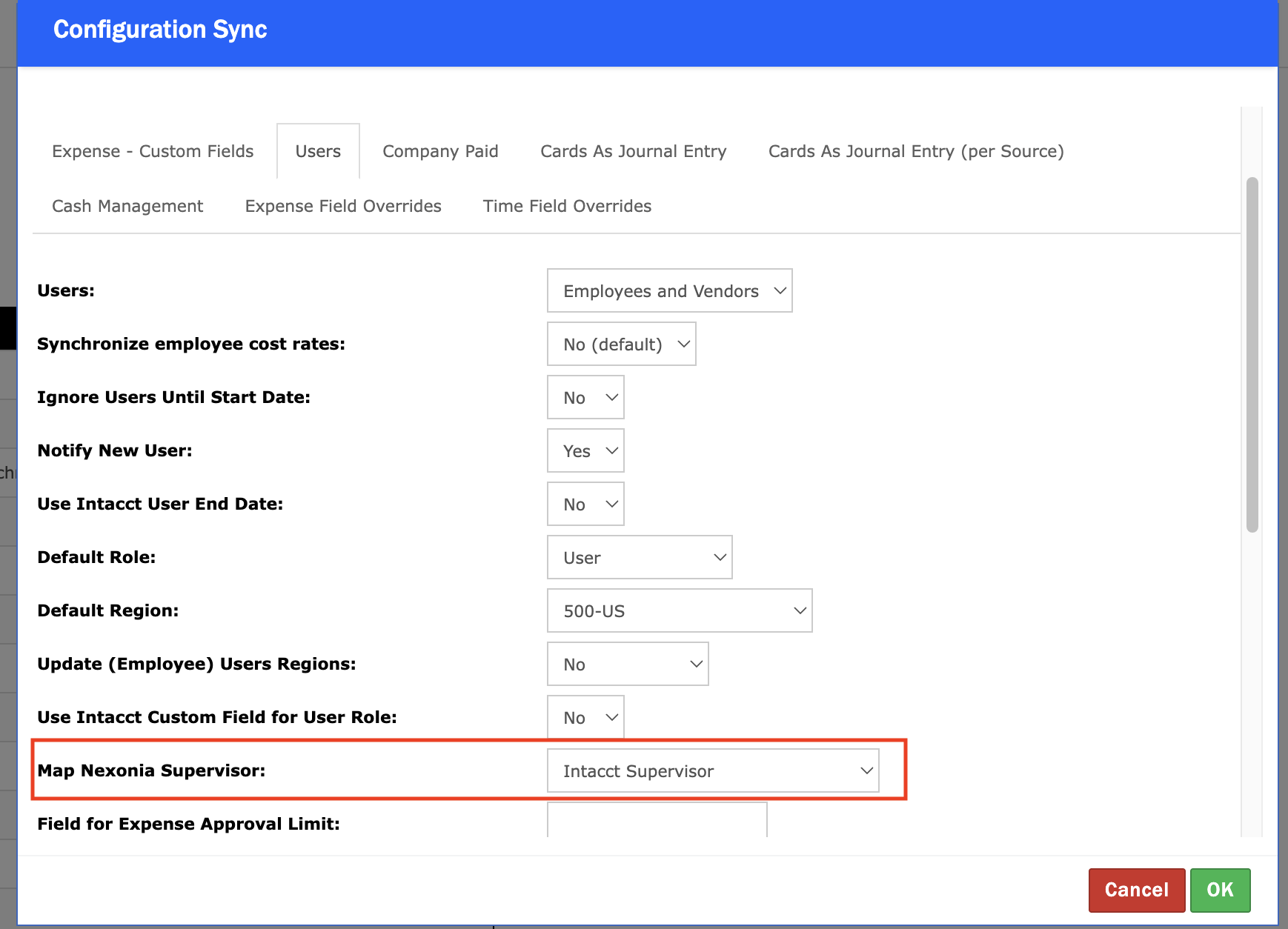 For Nexonia users who are synchronized from Intacct Employees, the Nexonia users' managers can be synchronized from the Intacct Employee's Supervisor.